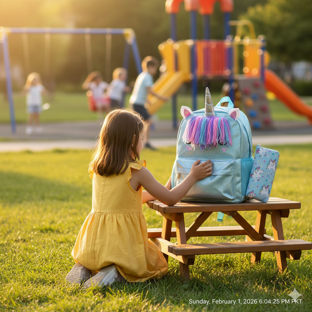 Magical unicorn-themed backpack set includes main backpack, matching pencil case, and front pocket for small essentials. Made from water-resistant polyester with reflective accents for safety. Features padded back panel, adjustable straps, and side mesh water bottle pockets. Dimensions: 15″x11″x6″. Complete with rainbow mane and horn details.