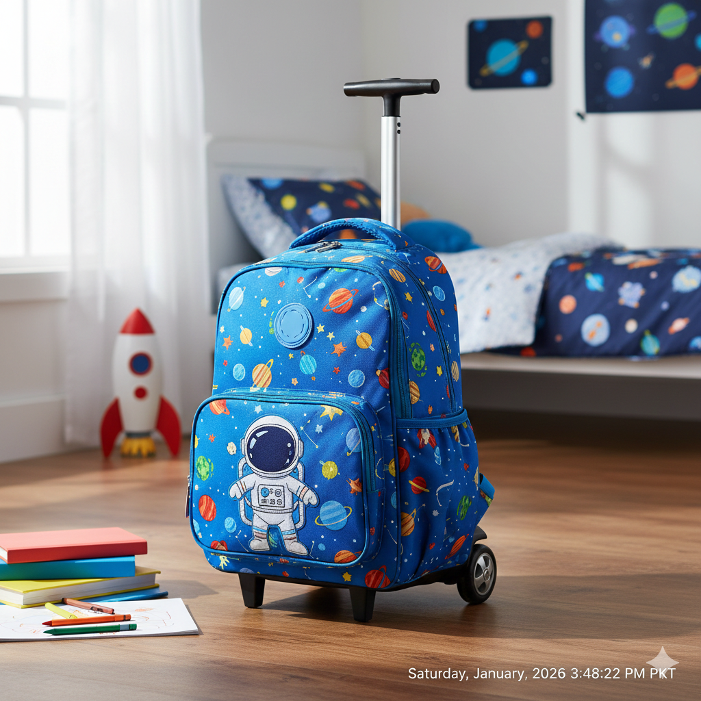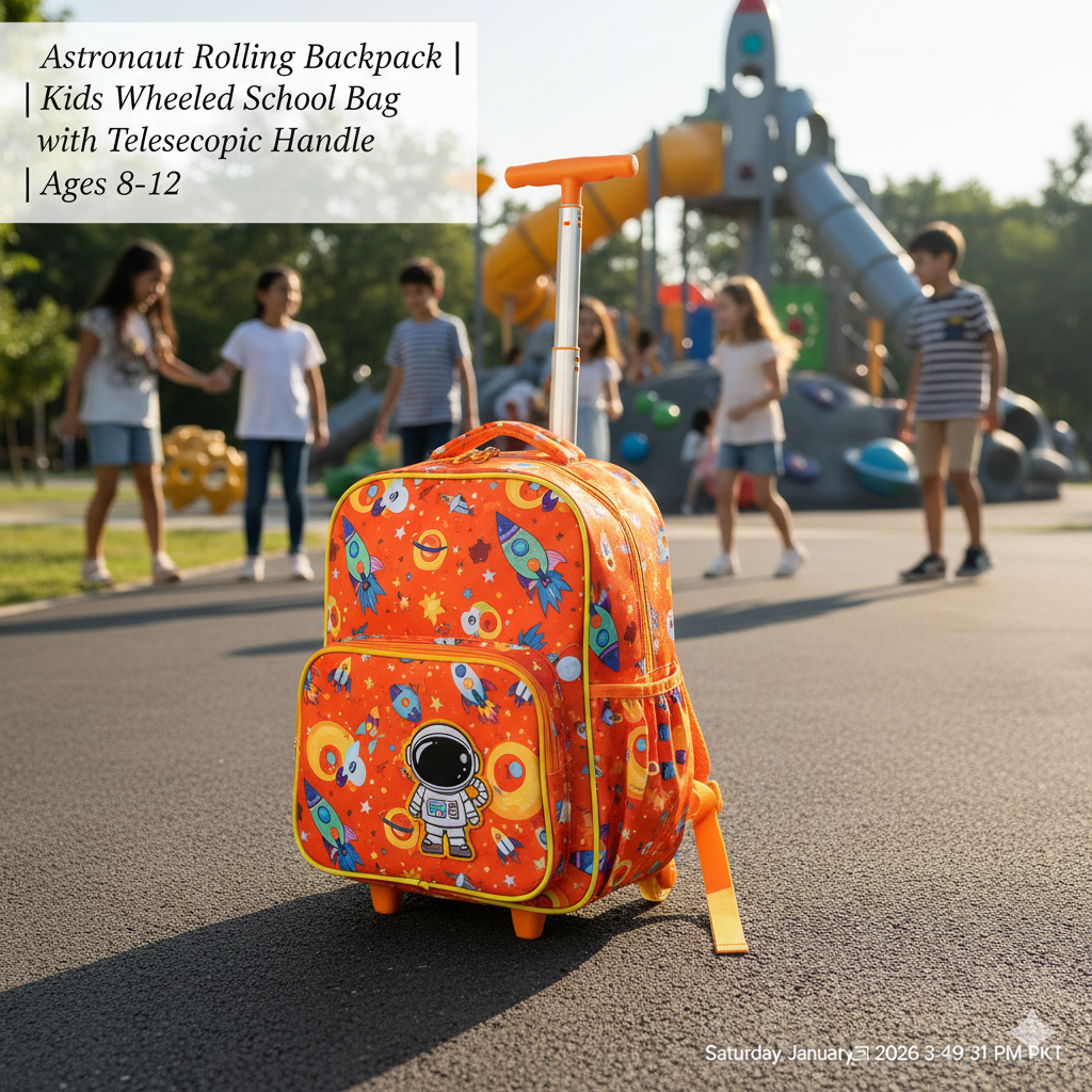 Galaxy-themed rolling backpack with retractable handle and durable wheels. Features multiple compartments for books, laptop sleeve (fits up to 13″), and organizational pockets. Made from tear-resistant polyester with reinforced stitching. Perfect for students with heavy loads or walking to school.